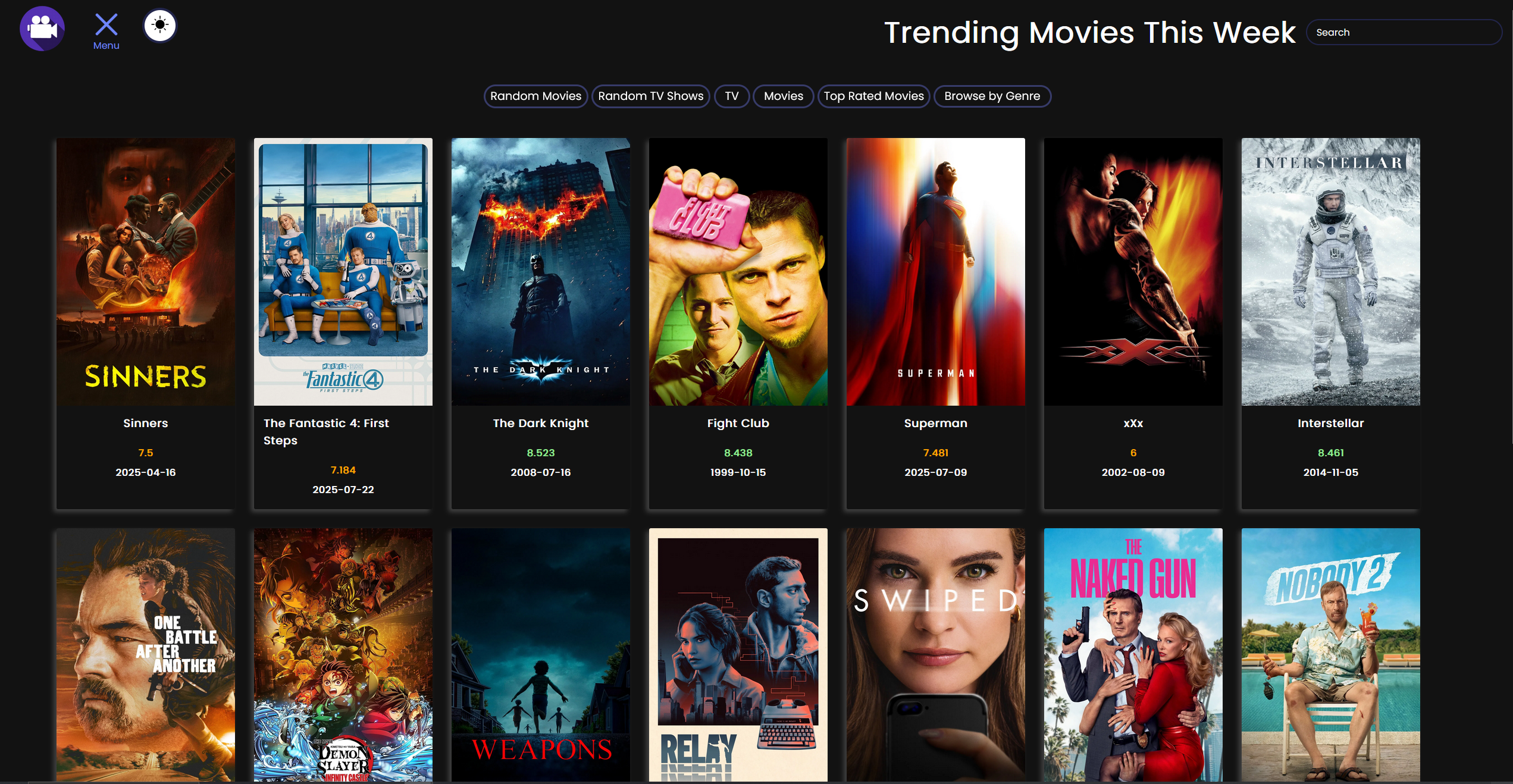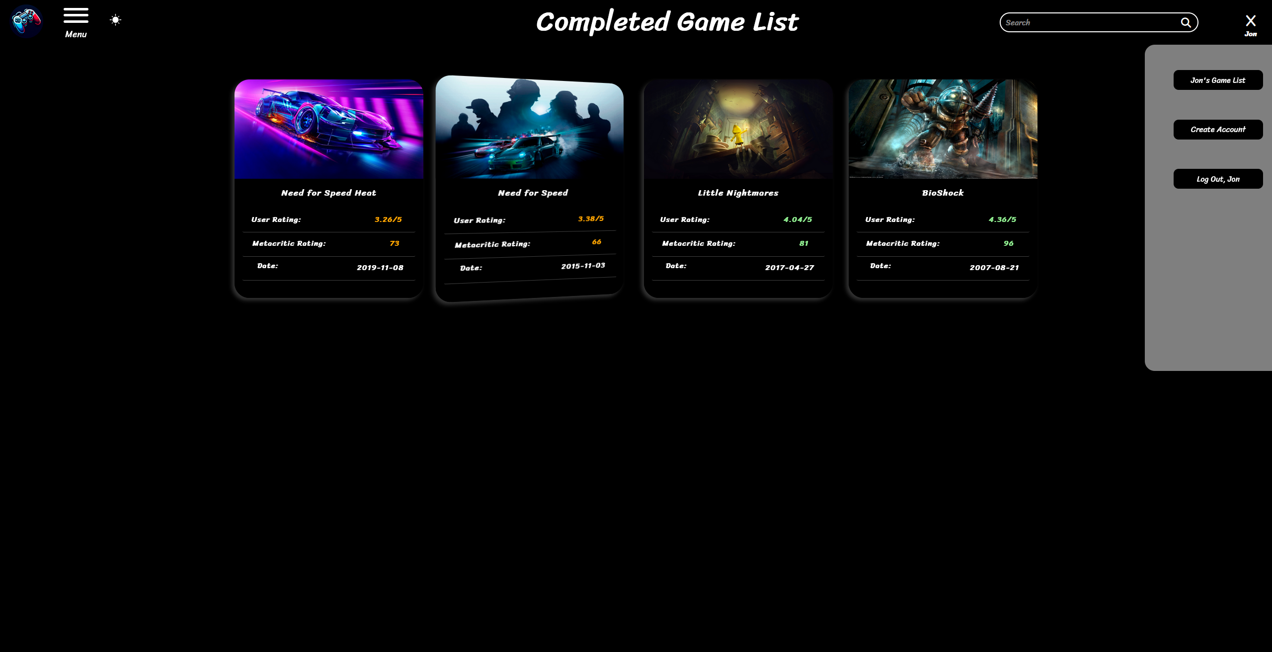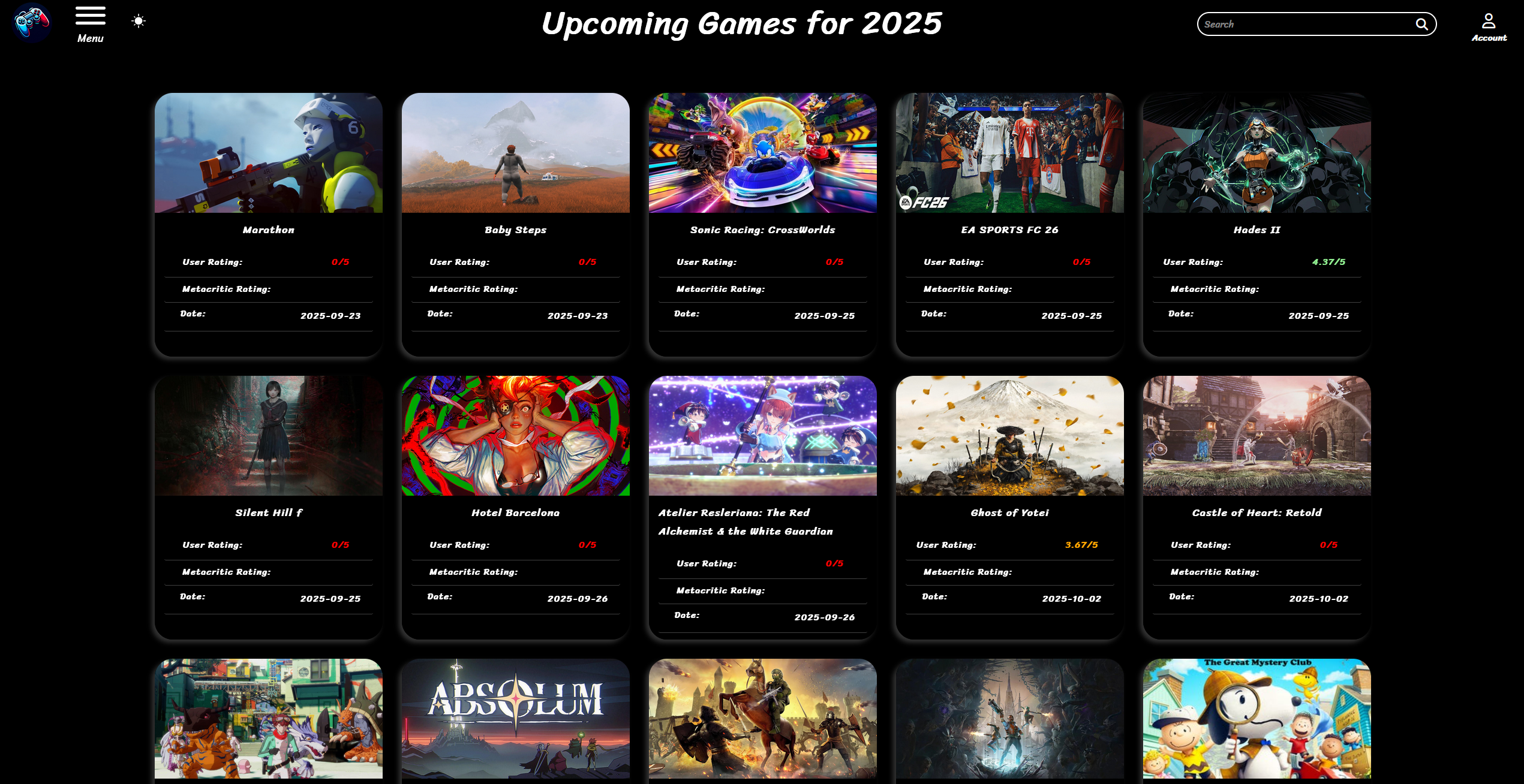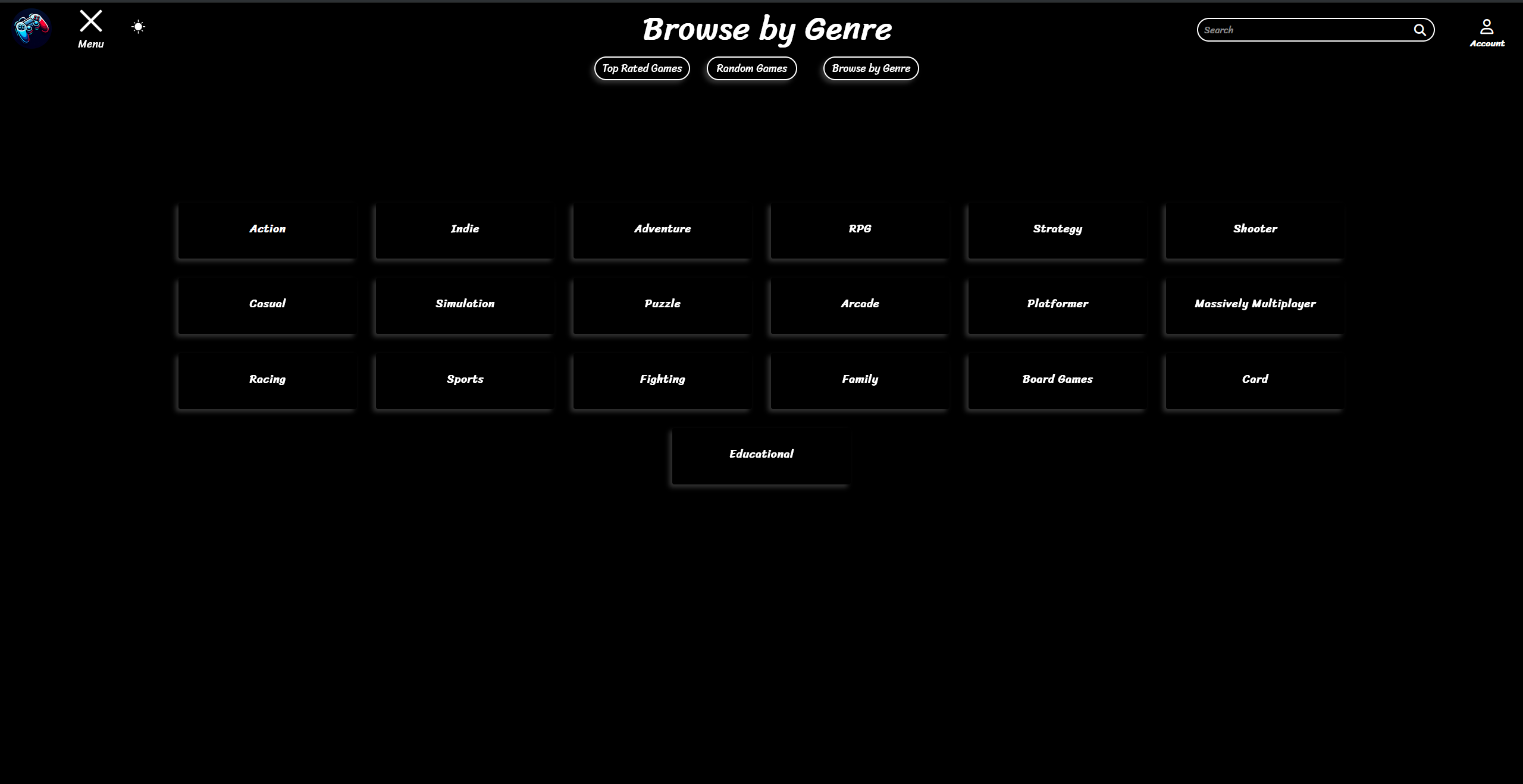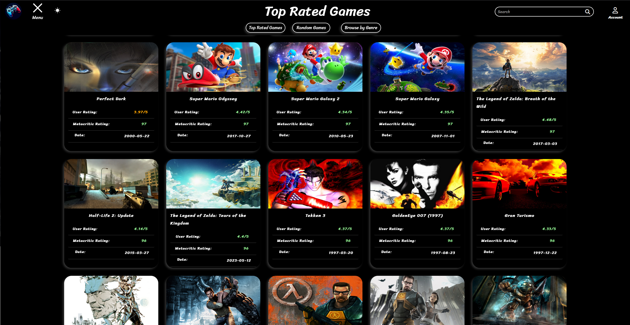 Users can browse top-rated, random, or genre based games, manage personalized game lists after signing in, search titles, view descriptions, and navigate pages all through an intuitive menu and account interface.